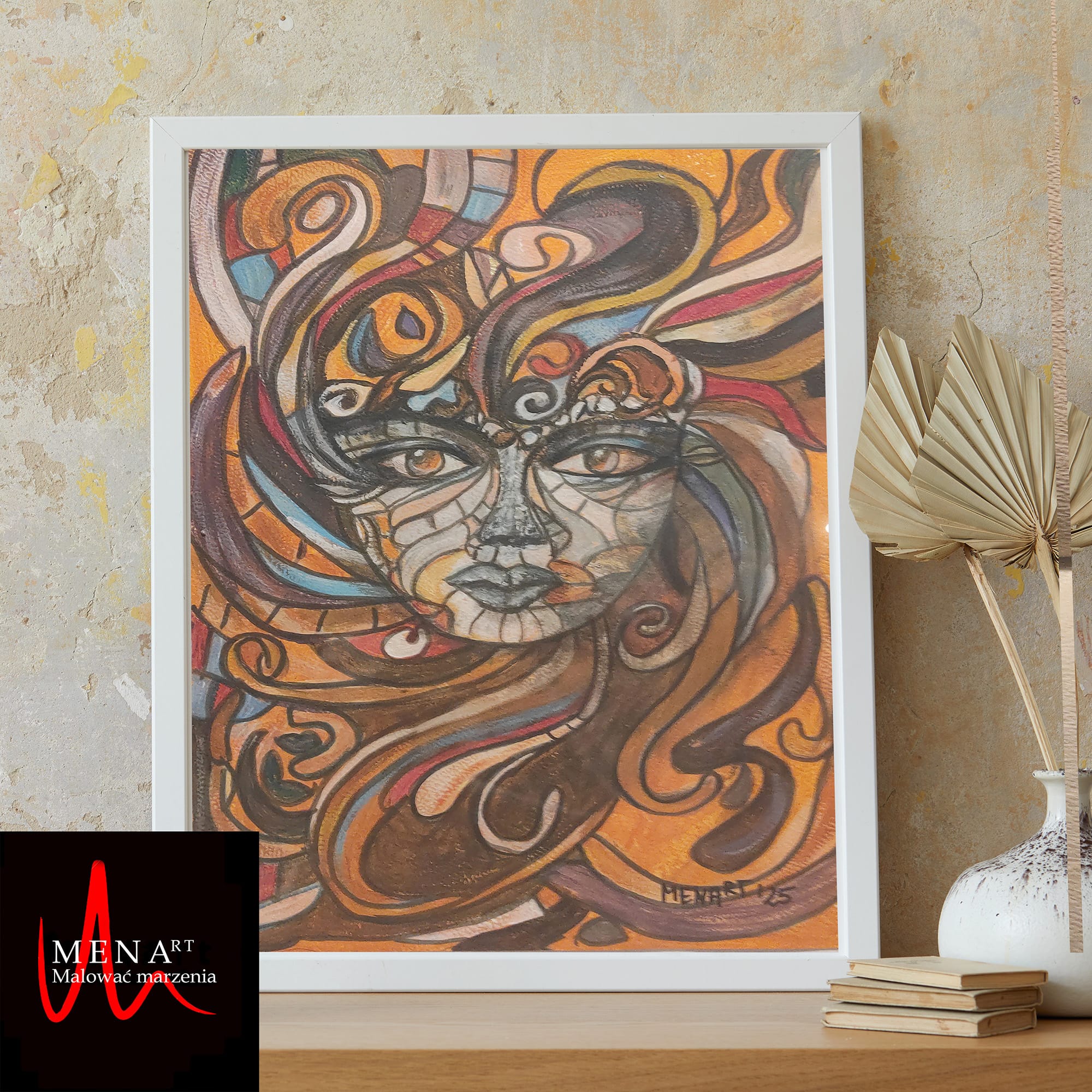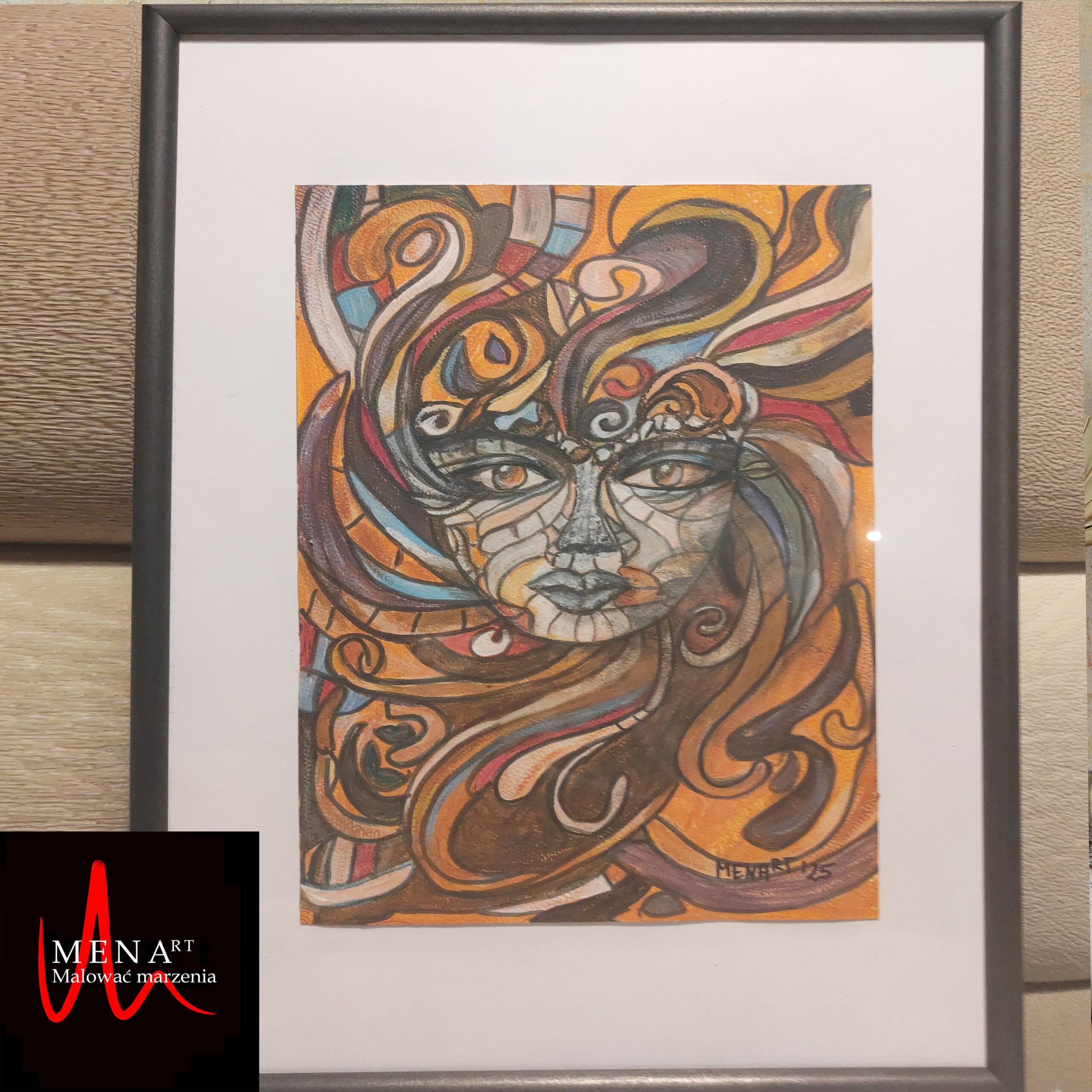 Namalowałam go na papierze malarskim w formacie A4, używając mocnych, dynamicznych kolorów i wijących się linii, które tworzą twarz ukrytą wśród fal intensywnych uczuć.